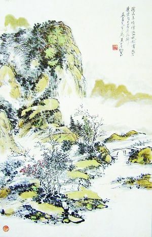 和入蜀前画风相比:线条运用注重起承转合,愈加率意奔放、劲健虚灵;皴法亦变得丰富,较之贯用的长披麻皴化为长短不一,方向不同,线性不同,顺锋逆锋交错互用;浓、淡、尖、圆、竖、卧多种形状的点子皴浓密厚重、聚散有致;同时注重了水、墨、色的浑化融合,丹青隐墨,墨隐丹青。(刘胜利)