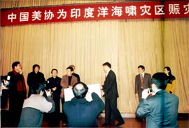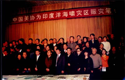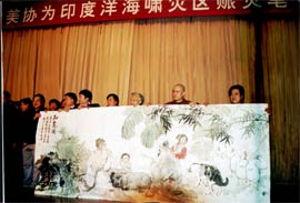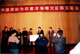 中国美术家协会赈灾捐款百万元 印度洋海域造成的死难人数在不断上升,数百万灾民急需救助,为了发扬中华民族扶危济困的传统美德,2005年1月8日上午,中国美术家协会在北京华都饭店举办了“中国美协为印度洋海啸灾区赈灾笔会”。 中国美协发出倡议后,得到了150余位在京中国美协会员的积极响应,画家们在笔会现场挥毫泼墨,用画笔、用热情、用爱心表达着对受灾国家人民的深切同情和关怀,为救济和重建灾区作出了中国美术家的贡献。 中国美术家协会党组书记、常务副主席刘大为同志代表各位会员当场将捐献作品所得100万元交给中国红十字会总会常务副会长江亦缦同志。 此前,中国美协机关干部、职工50余人为海难捐助的7000多元现金也送交中华慈善总会。 中国美协目前正在接受外地会员为海啸灾难捐献的作品,准备组织第二批捐助。