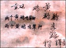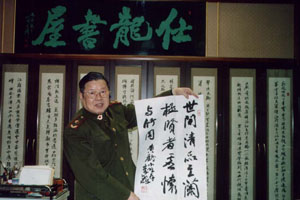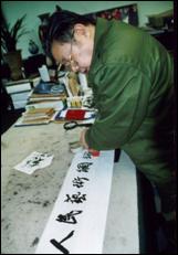 记得在军事博物馆恩师李铎的工作室,老师说要考考我,看我的书法有没有进步,于是先让我写“黄鹂”两个字,我很快完成。写完后老师再让我再把“两个”和“鸣翠柳”前后连起来,也许是在老师面前有些紧张的缘故吧,居然写的字连自己都觉得脸红,我低着头不敢看老师,可老师没有批评我,但语重心长的对我说:书法不仅要把单个字写好看,而更要的是看它的整体效果。你再写草书的“黄鹂”两字。老师说:“黄”字还可以,但是“鹂”字这样写就不好看了,应该这样写才好看--于是马上写了几个“鹂”字,说:你写字一定要在草写的基础上体现字的美,只有这样才能达到真正意义上的书法效果。从现在开始,你得临摹柳体、颜体楷书。记住临摹一定要像,一定要在“像”字上狠下功夫,要一个字一个字地反复临,临“像”一个再临下一个,一定要一丝不苟地临摹,细致入微,悟出字帖的内涵才算是真正的临摹,不能只满足于形似,更重要的是神似。切记好高婺远啊!学书法一定要沿着“临、立、变、创”的路子走,“临”就是临帖,这个字你已经领会了,后面三个字回家再好好揣摩揣摩,下次来一定要谈谈你对这几个字的感想……说着说着他便拿出一张纸,平整的铺展在桌上,边准备笔墨,边给我讲授着书法创作要领。他说:书法创作好似统帅千军万马,要有全局在胸,要有运筹调拨,还要有一往无前、一气呵成的气势……看到老师这般好的兴致,我情不自禁的端起相机拍下了特殊意义的镜头。这时,老师他不在言语了,全神贯注,奋笔疾书起来。奇怪的是每个字的长短、大小、疏密、宽窄竟然都是听凭他随心所欲,要怎样便是怎样,真是意随心到,笔随势生;不到十分钟,又一幅动律优美的作品,便结构严谨、神韵无穷地布满在这张宣纸上:“世间清品至兰极、贤者虚怀与竹同”。