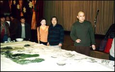 与恩师在海啸赈灾笔会上(右)史国良 (画案上为恩师、赵志田、史国良合画的“和气图”) |