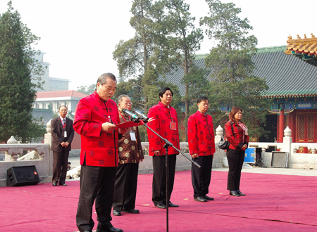 台湾海峡两岸和平统一促进会会长郭俊次宣读拜谒三皇五帝的颂文 开始拜谒前,台湾海峡两岸和平统一促进会会长郭俊次宣读了拜谒三皇五帝的颂文。曾撰写和手书“历代帝王庙重光后叙”一文的中国著名教育家、书法家欧阳中石也前来参拜。海外著名侨领陈大江、刘海燕、陈福坡、郑建文、王长利、林竹松、李国强、江志成代表 5000 万华侨华人向三皇五帝敬献了花篮。 在拜谒活动中,百余名海外华人侨领代表和台湾、香港、澳门同胞代表,进入了巍峨雄伟、庄严肃穆的景德崇圣大殿,拜谒三皇五帝灵位并敬献花篮。拜谒现场还经特别安排,精心再现了清朝皇帝亲祭三皇五帝的场景,使参加拜谒活动的同胞感受到天下共尊三皇五帝这一悠久和深厚的文化传统。 始建于明代的北京历代帝王庙为全国重点文物保护单位,是明清两朝全国唯一供奉自中华始祖伏羲、炎帝、黄帝至历代帝王的皇家庙宇。庙内共入祀三皇五帝及夏、商、周、汉、唐、宋、辽、金、元、明等主要帝王 188 位,功臣名将 80 位。从明代至新中国成立前,北京历代帝王庙一直是中华儿女同祭共拜列祖列宗的祭祀之地。 三皇五帝是中华民族的祖先,天下炎黄子孙同宗同源。这种血脉亲情,世代相传,永无休止,具有强大的民族凝聚力和感召力。这种数千年形成的文化传统也充分体现在历代帝王庙的祭祀制度之中。