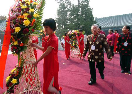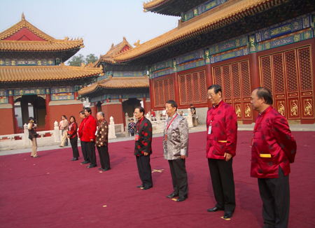 隆重的首届盛装祭拜盛典 人民艺术网 9 月 28 日 讯: 2005 首届海内外华侨华人相聚北京拜谒三皇五帝盛典, 9 月 27 日 在北京历代帝王庙隆重举行。海外近三十国家和地区的 150 余位著名华商及社团领袖与北京市共 300 多人举行了首届盛装祭拜盛典。