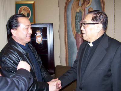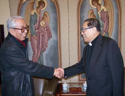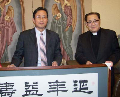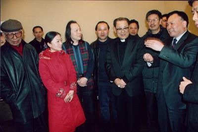 人民艺术网2006年1月20日讯:2006年1月20日,世侨会秘书长任兴亮、艺术网执行官黄鹂带领首都七位著名书画艺术家,来到中国天主教堂,向全国人大副委员长、中国天主教爱国会主教傅铁山拜年,恭贺2006狗年新春。