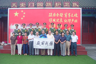 7月29日在中国人民解放军建军79周年即将来临之际,北京华夏风情书画院院长常健君,邀请共和国将军赵荣壁,带领书画院沈玉萍、张永金、马东升、李淑英、孙汝春、王海滨等八位书画家赴武警天安门支队向武警官兵赠送书画作品和三十余册图书,并在天安门国旗护卫队举行赠送仪式。在赠送仪式上北京华夏风情书画院院长常健君发表了讲话,他说:“北京华夏风情书画院有着悠久的拥军传统,这次组织书画家来到天安门国旗护卫队,也是响应中国书协开展‘中国书法家进万家’的号召,也是书画家以精湛的书画艺术,对人民解放军表达无限热爱的具体行动。”武警天安门支队支队长、政委以热情洋溢的语言,热烈欢迎书画艺术家的到来,他们在欢迎词中说:“军爱民,民拥军,军民鱼水情,永远不可分!”
