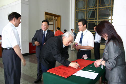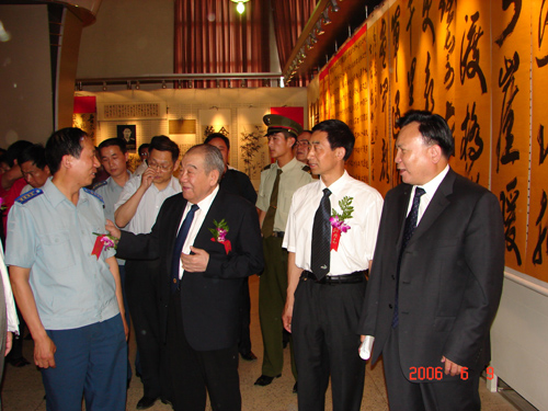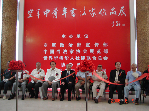 (人民艺术网2006年6月9日讯)为纪念建党八十五周年,纪念红军长征胜利七十周年,由中国人民解放军空军政治部宣传部、中国书法家协会展览部、世界华侨华人社团联合总会爱宣委共同主办的2006空军书法精选作品展,今天在北京中国革命军事博物馆开幕。全国人大常委会原副委员长布赫与近百位陆海空、武警将军,部长、海外侨领及首都各界近千人出席了开幕式。中国书协领导、空军部分领导、社会知名人士纷纷为展览题词祝贺。这是近年来空军书法成就的一次全面展示,也是空军书法工作者献给党和祖国的一份特殊礼物,展览大厅光彩四射,佳作连篇,倍受青睐。