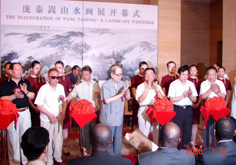 人民艺术网2006年7月22日讯:(记者 赵进)今天,由中国美术家协会、世界华侨华人社团联合总会、中国国际书画研究会、广东省美协共同主办的著名画家庞泰嵩“庆八一”艺术作品展在北京中国美术馆开幕,全国人大常委会副委员长傅铁山,全国政协原副主席孙孚凌,军事科学院原政委王诚汉上将,全国人大常委、总后勤部原政委周克玉上将,全国政协常委、军事科学院原院长刘精松上将,全国政协副秘书长卢昌华,总政治部宣传部副部长张西南将军,全国人大常委、中国教育国际交流协会会长柳斌,全国政协常委、民族和宗教委员会副主任金日光,九届全国政协常委、空军原副政委高兴民中将为画展剪彩。首都军队机关代表,首都文化艺术界代表,老将军、美术界专家学者、部分驻华使节、海外华侨及各界人士800余人出席了开幕式。这是人民解放军纪念建军七十五周年活动的纪念首篇。