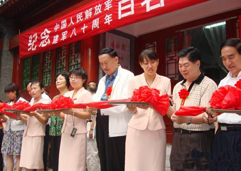 全国政协常委、国家文化部原部长刘忠德,九届全国人大常委、北京军区原司令员李来柱上将,全国政协委员、空军原副司令员景学勤中将,世侨会秘书长任兴亮,中国城市经济学会秘书长张巨功,北京市宣武区政协副主席袁双梅等为开幕式剪彩。老将军杨卫群、李春明、江伟文、荆心泉、贾启玉、孟凡工、翟新发、申解民、崔儒勇、葛文楣、邱士振、邱祖余、沈甸之、张本忠、李成年等出席了开幕式。新华网、人民网、中央电视台、中国国际广播电台、人民政协报、北京晚报、香港文汇报、香港大公报、国际日报、欧洲华人报等应邀参加了年展览报道。 由世界华侨华人社团联合总会、中国城市经济学会主办,香港文汇报协办,北京卢沟桥宛平城清秘阁承办的“向建军80周年献礼,共和国百将军威风采展览”,采用引人的现代艺术效果,突出了共和国将领们英姿壮美的光辉形象。一幅幅精美的将军彩色正面帧照及光辉经历,让参观者们走进了将领们详实的成长经历和非凡的战斗历程。让人们体验着人民解放军无私奉献,不怕牺牲的坚定爱国主义信念和崇高的共产主义理想。展览配展的将军书法作品与将军的英姿形象显明对照,形成了传统的书法艺术效果与将军威严潇洒的英俊军容相匹相衬、壁玉妙合的强烈效果。观众反映,这次“向建军80周年献礼,共和国百将军威风采展”,形势新颖、内容创新,为观众们景仰军威,欣慰军容,发扬人民军队的光荣革命传统,提供了更加直观的艺术效果。