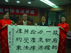 讲座开始前,举行了聘请常健君为中国人民大学法学院艺术顾问暨常健君书法作品收藏仪式,全国人大法律委员会委员、中国法学会民法学研究会会长、中国人民大学法学院院长王利明教授,代表法学院向常健君颁发证书、赠送纪念品,并就常健君应邀到法学院讲学给与高度的评价。