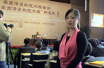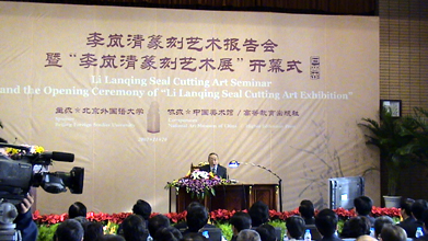 北外逸夫楼第三阶梯教室里呈现出一派古雅风格。写有“方寸之间 气象万千; 以石言志 笔情刀趣;以刀代笔 运刀如笔;汲古铸今印外求印”的巨幅海报悬挂在会议两侧,烘托了篆刻艺术的主题。五百余名北外师生聚集在此,期待聆听李岚清篆刻艺术的报告。在一个小时的报告中,李岚清向师生们介绍了他近年来从事篆刻艺术创作的初衷和感悟,阐述了中国传统优秀文化艺术的博大精深,讲解了他篆刻作品的深刻含义。他希望这次篆刻艺术展,有益于广大知识分之和青年学生喜爱篆刻艺术,了解和感受中国文化的丰富内涵,热爱祖国的传统文化,提高审美情趣和文化艺术修养。整个报告精彩纷呈、诙谐风趣,把听众带入了一个篆刻艺术的魅力世界。