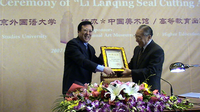 开幕式上,李岚清向北京外国语大学赠送了他本人篆刻的“北京外国语大学之印”和《原来篆刻这么有趣》一书。北京外国语大学校长郝平同志接受捐赠并向李岚清颁发了收藏证书。