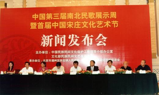 文化部民族民间文艺发展中心主任李松、文化部社图司司长李康、中共北京市通州区宋庄镇党委书记胡介报、镇长陈宇等领导出席了会议 原生态的民间歌曲,是各族人民在生产生活中创造的、在民间广为流传的音乐形式,是非物质文化遗产的重要组成部分。随着“中国民族民间文化保护工程”的逐渐展开,非物质文化遗产逐渐得到社会各界的重视和支持。保护和弘扬优秀非物质文化遗产,成为社会的共识。为展示和弘扬我国各具特色的民间歌曲,进一步扩大优秀非物质文化遗产的社会影响,主办方在成功举办“第一届”(浙江仙居)、“第二届”(山西左权)南北民歌比赛及在北京举办多场“天籁之声”公益演出活动基础上,将于 2005 年 10 月 21 日 至 25 日,移师北京宋庄,推出第三届中国南北民歌展示周活动。来自全国 20 多个省、市、自治区的多位民间歌手将汇聚宋庄,进行六场民歌的展示,并举行天籁之音---中国原生态民歌大型演唱会--宋庄之夜。 宋庄文化艺术节的一个重要活动就是当代中国文化艺术展--《宋庄路》。宋庄镇是著名的文化名镇,目前正在实施“文化造镇”的战略。从二十世纪九十年代中期开始,一些艺术家开始在宋庄安营扎寨,其中,方力钧、刘炜、岳敏君和扬少斌等人,已经成为中国当代艺术群体里的重量级人物。居住在宋庄里的中国艺术大师黄永玉、艺术评论家栗宪庭、奇石收藏家张源,更是宋庄独有的名人资源。在这里,画家、收藏家、诗人、书法家、摄影家们用各种派别、各种题材的作品,表达着各自对生活的诠释和思索,逐渐形成了一个融汇各种风格艺术的集聚区。现在,宋庄已经成为北京乃至中国规模最大、知名度最高的画家村群落。宋庄路的创意理念就是艺术家王能涛、班学俭、马越完成的。《宋庄路》活动本身既是艺术家的一部作品,也是宋庄艺术节的一大亮点,体现着乡土气息和淳朴质地,将会给我们带来亲切感,张扬宋庄的自然风貌和亲和力,展板上张挂艺术家的作品,表达着艺术见同宋庄的依赖情节和完美结合。 第三届中国南北民歌展示周”暨“首届中国宋庄文化艺术节” 是挖掘、保护、弘扬优秀文化艺术的一次重要活动,其目的就在于:挖掘“原生态”文化,保护“原生态”艺术;唤醒全社会保护中国传统文化资源,保护、拯救中国民歌资源;发掘和保护民间歌手。同时,文化节活动还将体现出中国宋庄“艺术生活,和谐宣居”的主题以及打造中国宋庄“艺术名镇、经济强镇”的理念。